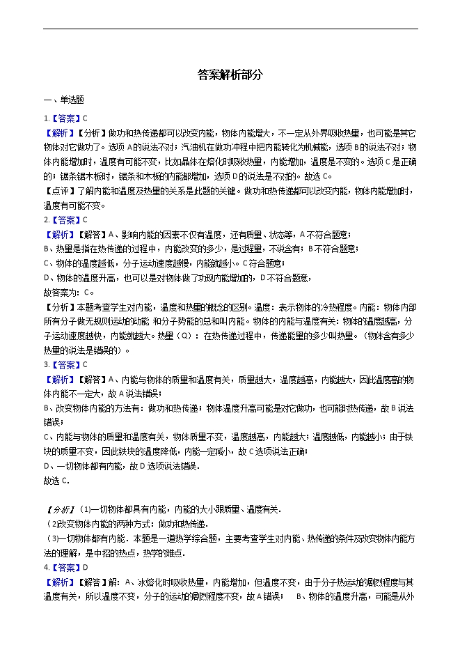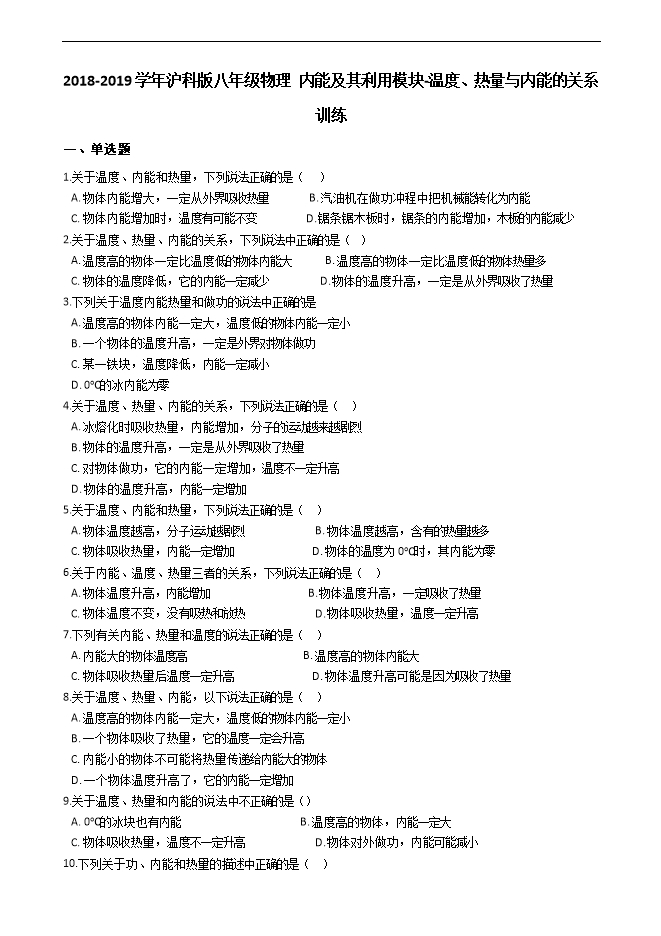 2018-2019学年沪科版九年级物理训练:内能及其利用模块--温度、热量与内能的关系(附解析)
