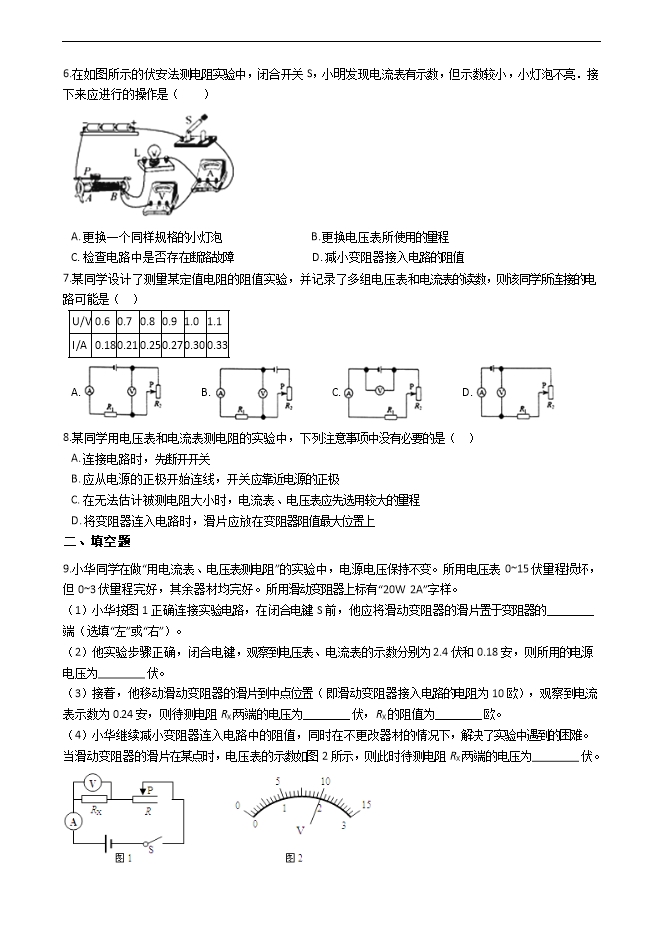 9.小华同学在做“用电流表、电压表测电阻”的实验中,电源电压保持不变。所用电压表0~15伏量程损坏,但0~3伏量程完好,其余器材均完好。所用滑动变阻器上标有“20W 2A”字样。