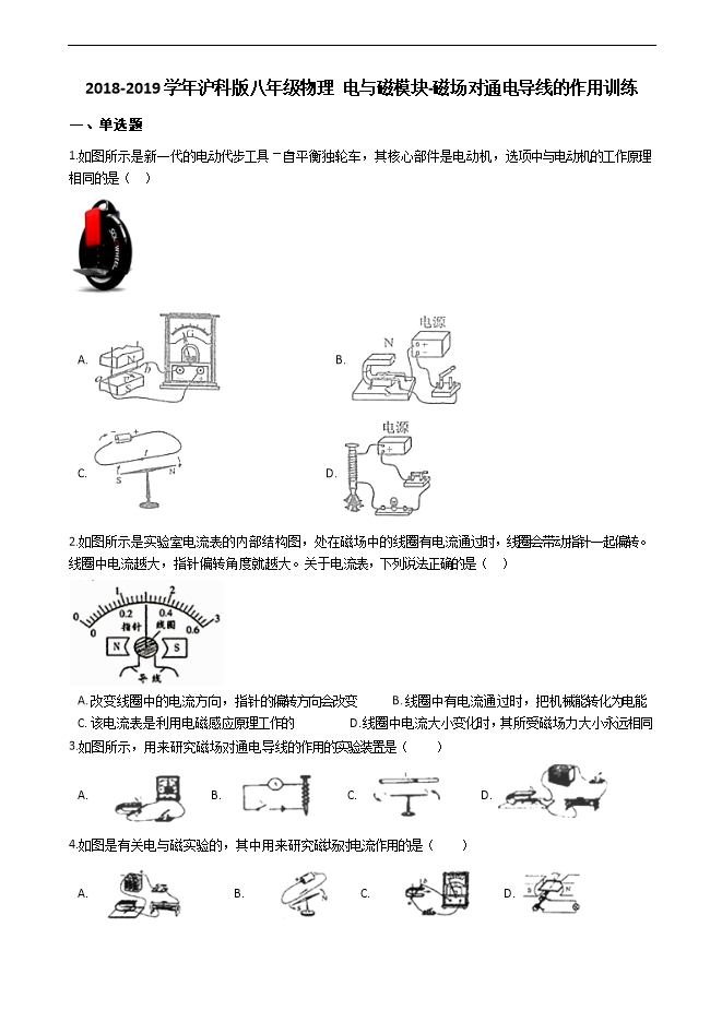 2018-2019学年沪科版九年级物理训练:电与磁模块--磁场对通电导线的作用(附解析)