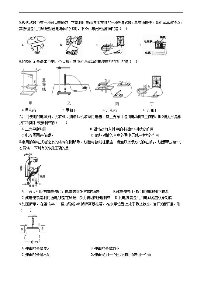 5.现代武器中有一种新型电磁炮,它是利用电磁技术支持的一种先进武器,具有速度快、命中率高等特点,其原理是利用磁场对通电导体的作用.下图中与此原理相同的是( )