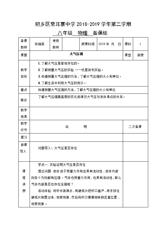 (教科版)2018-2019河北省邯郸市肥乡区常耳寨中学八年级物理下册教案:9.4大气压强