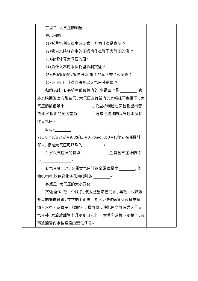 - 8322025春人教版八年级下册物理教学设计:9.3 大气压强(附教学反思)