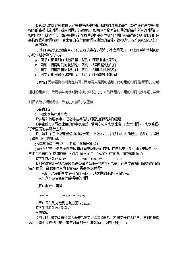 【总结归纳】比较物体运动快慢有两种方法:相同的时间比路程,路程多的速度快;取相同的路程比较时间,所用时间少的速度快.如果两个物体各自通过的路和所用的时间都不相同,怎样比较它们运动的快慢呢?在物理学中,采用“相同时间比较路程的长短”的方法.只要将路程和时间相除,算出各自在单位时间内通过的路程,就可以比较它们运动的快慢了.