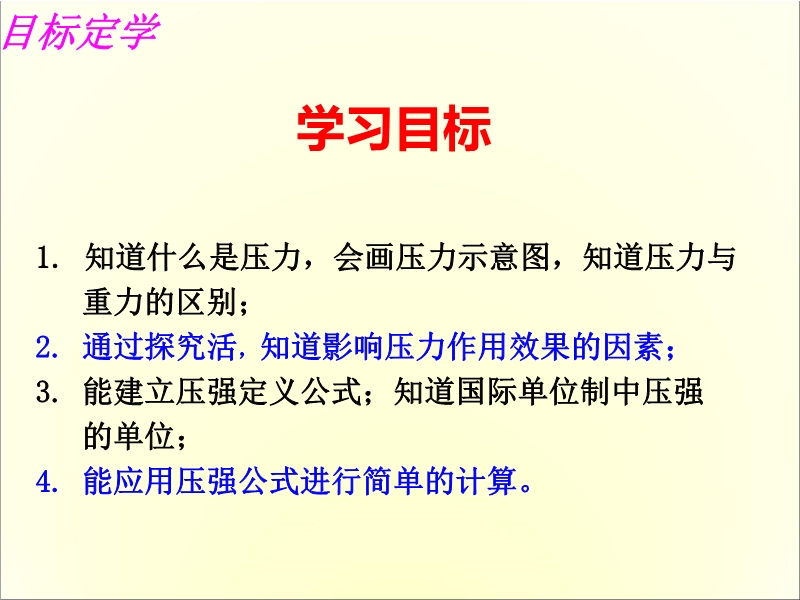 【内容简介】苏科版物理八年级 《10.1压强》PPT课件.共有17张幻灯片,首先通过生活实例得出压力的概念,通过画力的示意图,然后通过实验探究得出压力作用效果的影响因素,引出压强的概念,讲授了压强的公式及其应用。