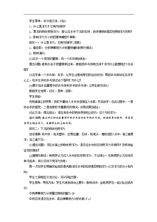 设计说明:通过对比加水后量筒中的乒乓球和水中的乒乓球,创造情景和条件,很容易使学生领会浮力,发挥学生的主体作用。