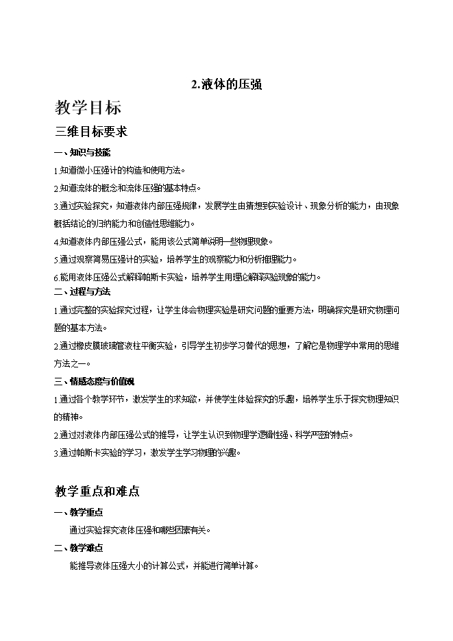 3.通过实验探究,知道液体内部压强规律,发展学生由猜想到实验设计、现象分析的能力,由现象概括结论的归纳能力和创造性思维能力。