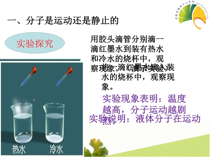 【内容简介】合肥市第四十八中学沪科版《11.2看不见的运动》ppt+动画.课件共有22张幻灯片,课件引导学生认识了物质是由分子组成的,课件通过动画展示了物质的扩散现象,说明分子在不停地运动、引导学生讨论了分子之间的作用力等。