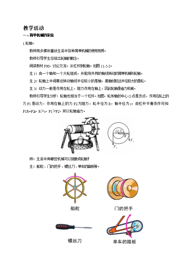 阅读教材P90,讨论交流:从杠杆到轮轴。如图11-5-3。