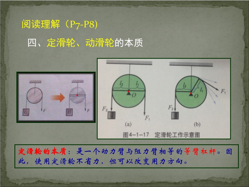 【内容简介】2019人教版《12.2滑轮》ppt课件,共有13张幻灯片。课件首先引导学生认识了滑轮,然后引导学生认识了定滑轮和动滑轮,并探究了它们的特点,讨论了它们的实质等.