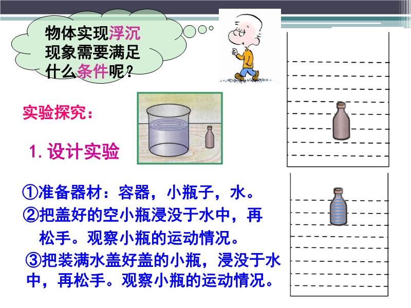 【内容简介】2019沪科版《9.3物体的浮与沉》PPT课件,共有24张幻灯片。课件引导学生通过观察生活中的现象提出有关的浮沉问题,通过探究了物体的浮沉条件,并引导学生应用力的知识进行分析,更有助于学生理解,课件最后展示了浮沉条件的应用.