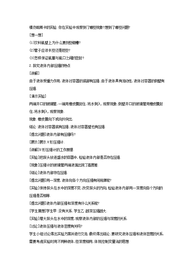 - 9312020春沪科版八年级物理下学期《8.2科学探究:液体的压强》教学设计(附教学反思)