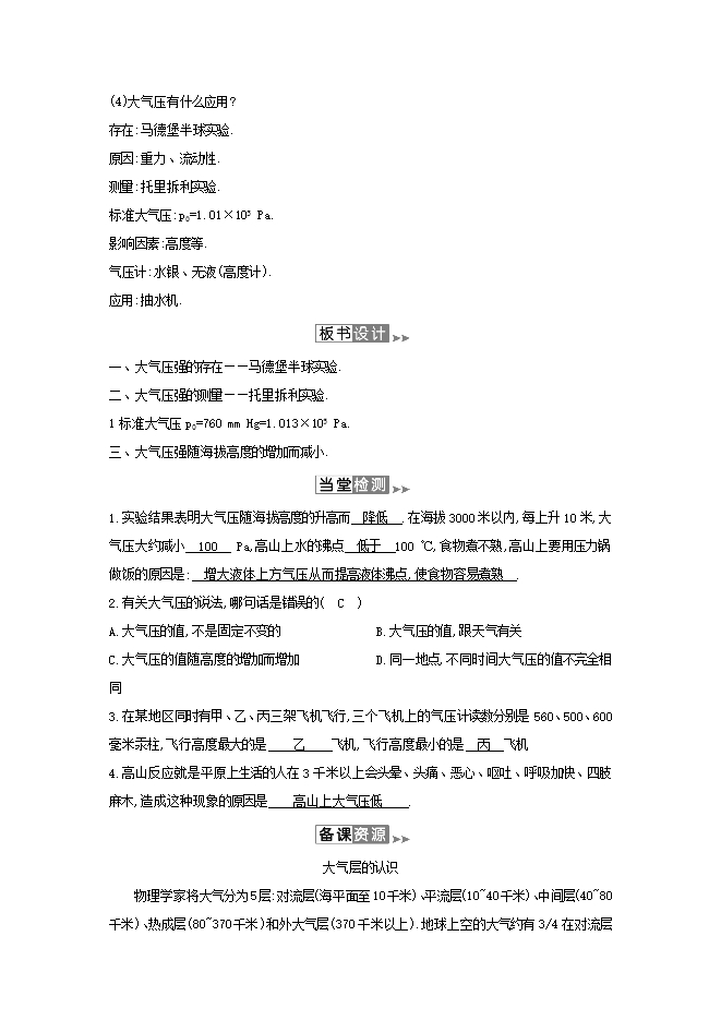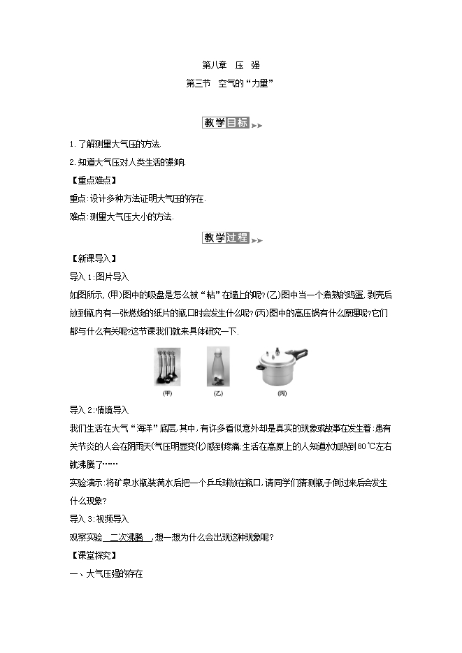 2019年春八年级物理下册沪科版教案:8.3空气的“力量”