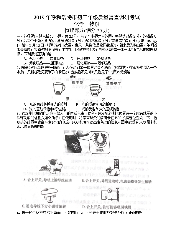内蒙古呼和浩特市2019年初三年级质量普查调研考试化学物理合卷试卷(物理部分,附答案)