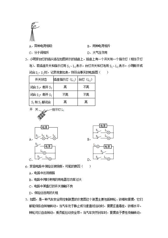 4.如图所示,把一根塑料绳一端扎紧,从另一端撕开成许多细丝,用干燥的手从上向下捋几下,发现细丝张开了。细丝张开的原因是( )