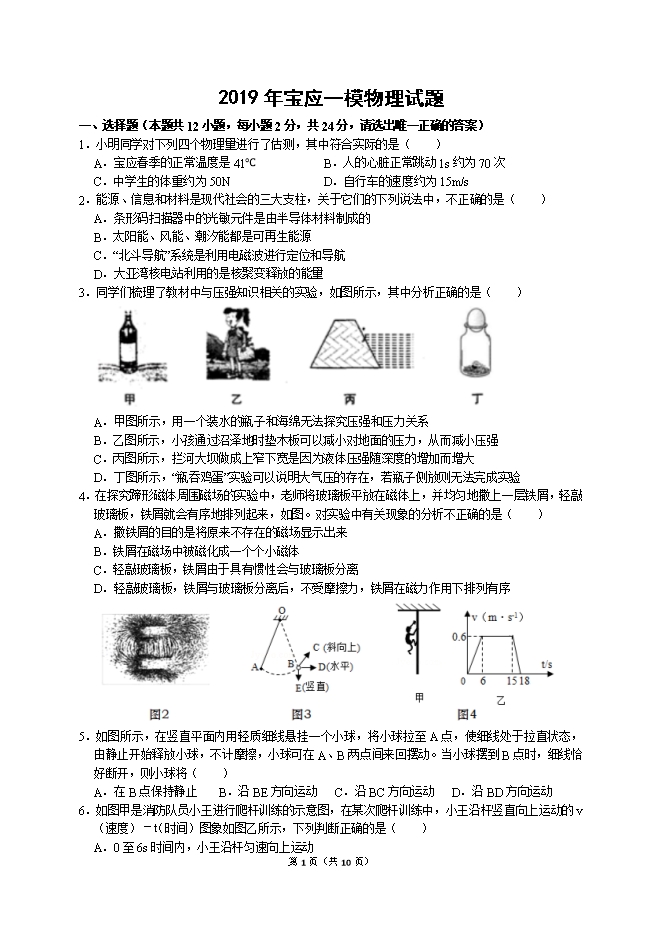 江苏省扬州市宝应县2018-2019学年九年级中考一模考试物理试题(word版含答案)