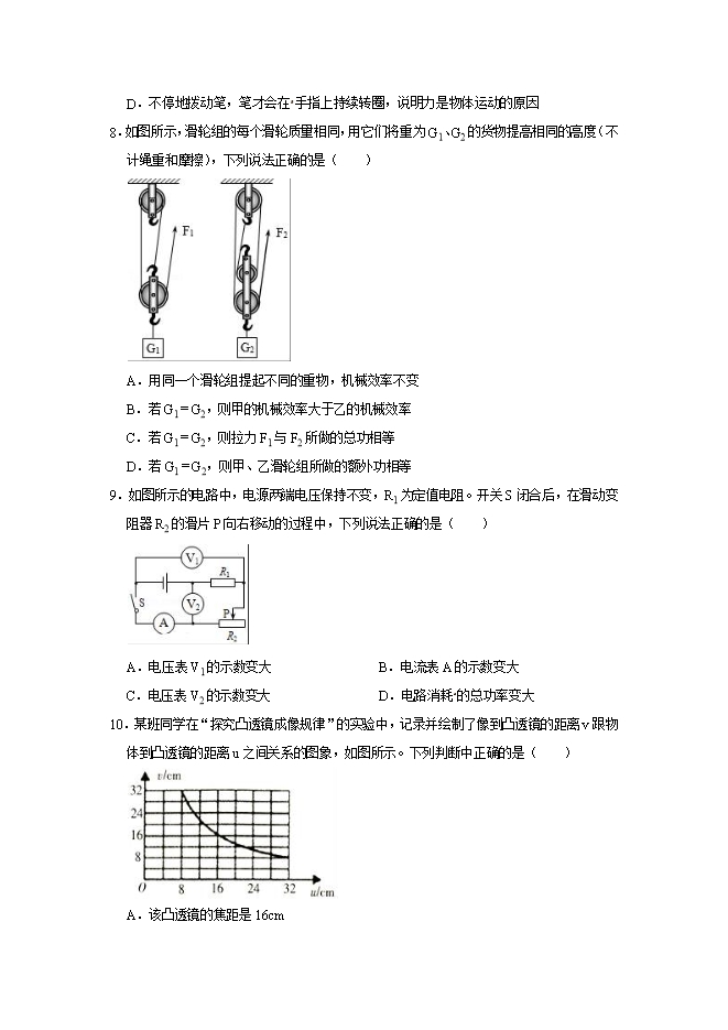 8.如图所示,滑轮组的每个滑轮质量相同,用它们将重为G1、G2的货物提高相同的高度(不计绳重和摩擦),下列说法正确的是( )