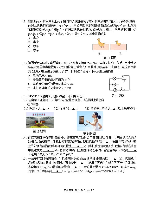 2018-2019第二学期江苏省南京市联合体九年级物理一模试卷(含答案)