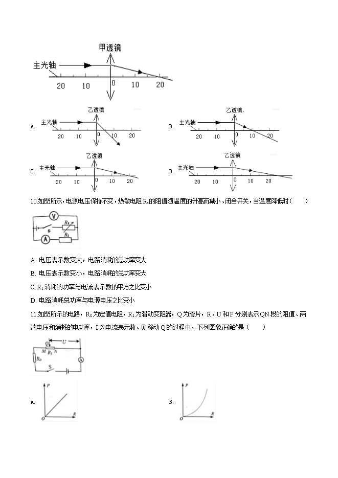 9.将物体分别放在甲、乙凸透镜前,物距相同,通过甲透镜成正立放大的像,通过乙透镜成倒立缩小的像。图是平行于主光轴的光线通过甲透镜的光路图,图中哪幅图可能是平行于主光轴的光线通过乙透镜的光路图( )