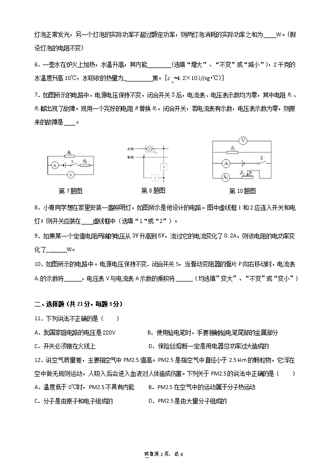 .一壶水在炉火上加热,水温升高,其内能 (选填“增大”、“不变”或“减小”),2 千克的 水温度升高 10℃,水吸收的热量为_ 焦。[c =4.2×103J/(kg•℃)] 7.如图所示的电路中,电源电压保持不变,闭合开关 S 后,电流表、电压表示数均为零,其中电阻R1、 R2 都出现了故障。现用一个完好的电阻R 替换 R2,闭合开关,若电流表有示数,电压表示数为零,则原来的故障是 。 第 7 题图 第 8 题图 第 10 题图 8.小青同学想在家里安装一盏照明灯,如图所示是他设计的电路。图中虚线框 1 和 2 应连入开关和电 灯;则开关应装在 虚线框中(选填“1“或“2”)。9.如果某一个定值电阻两端的电压从 3V 升高到 5V,流过它的电流变化了 0.2A,则该电阻的电功率变 化了_ W。10.如图所示的电路中。电源电压保持不变.闭合开关 S,当滑动变阻器的滑片 P 向右移动时,电流表 A1的示数将 ,电压表 V 与电流表 A 示数的乘积将 (均选填”变大”、“不变”或“变小”) 二、选择题(共 21 分,每题 3 分) 11.下列说法不正确的是( ) A.我国家庭电路的电压是220V B.使用验电笔时,手要接触验电笔尾部的金属部分C.开关必须接在火线上 D.保险丝熔断一定是用电器总功率过大造成的12.说空气质量差,主要指空气中 PM2.5 值高。PM2.5 是指空气中直径小于 2.5μm 的颗粒物,它浮在 空中做无规则运动,人吸入后会进入血液对人体造成伤害。下列关于 PM2.5 的说法中正确的是( ) A.温度低于 0℃时,PM2.5 不具有内能 B.PM2.5 在空气中的运动属于分子热运动C.分子是由原子和电子组成的 D.PM2.5 是由大量分子组成的