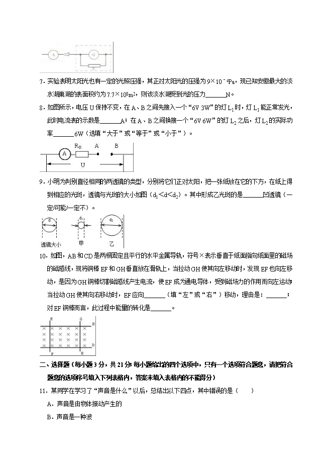 7.实验表明太阳光也有一定的光照压强,其正对太阳光的压强为9×10﹣4Pa,现已知安徽最大的淡水湖巢湖的表面积约为7.7×108m2,则该淡水湖受到光的压力 N。