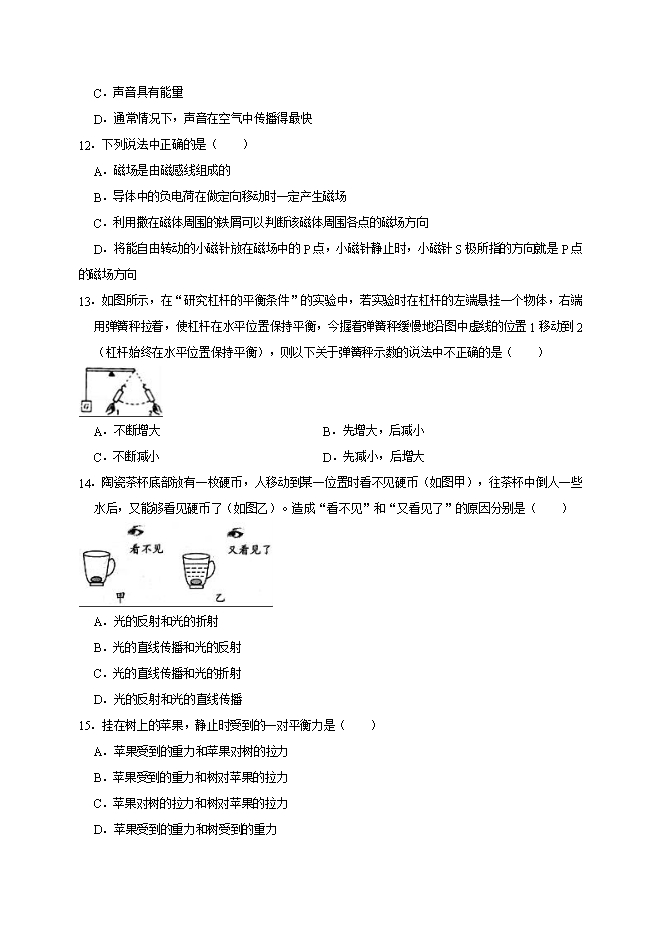 13.如图所示,在“研究杠杆的平衡条件”的实验中,若实验时在杠杆的左端悬挂一个物体,右端用弹簧秤拉着,使杠杆在水平位置保持平衡,今握着弹簧秤缓慢地沿图中虚线的位置1移动到2(杠杆始终在水平位置保持平衡),则以下关于弹簧秤示数的说法中不正确的是( )