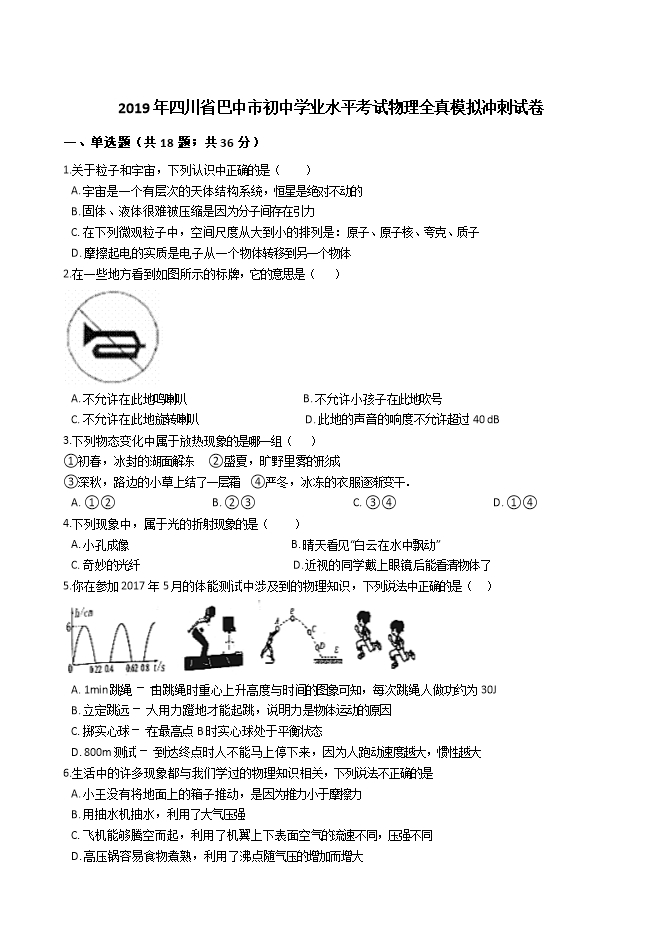 2019年四川省巴中市初中学业水平考试物理全真模拟冲刺试卷