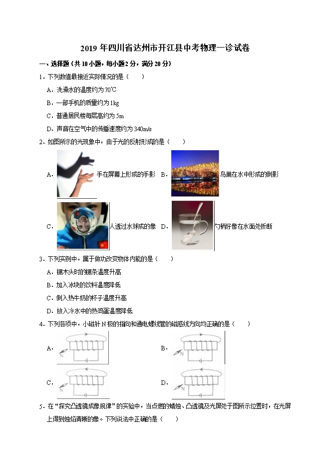 2019年四川省达州市开江县中考物理一诊试卷(解析版)