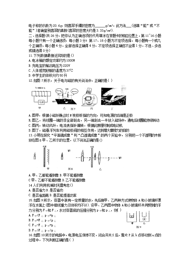 二、选择题(共26分,把你认为正确选项的代号填涂在答题卡的相应位置上,第11~16小题每小题只有一个正确选项,每小题3分;第17、18小题为不定项选择,每小题有一个或几个正确项,每小题4分,全部选择正确得4分,不定项选择正确但不全得1分,不选、多选或错选得0分)