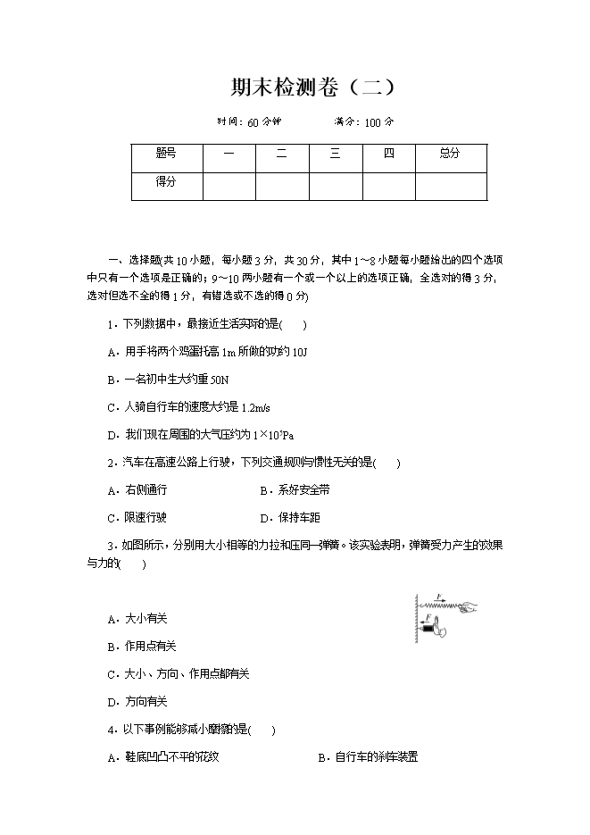 2019春教科版八年级下册物理期末综合检测卷(二)(附答案)