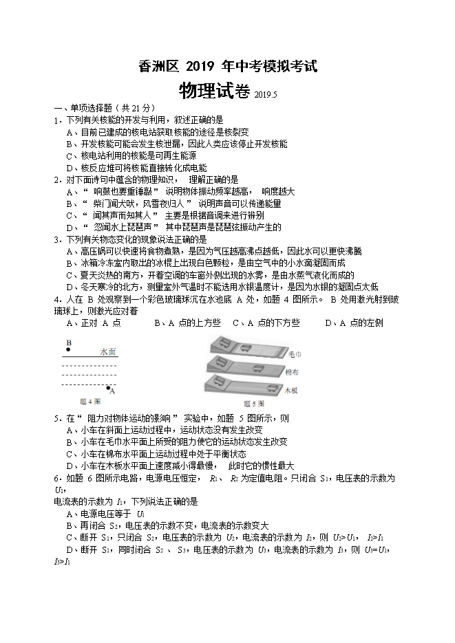 广东省珠海市香洲区2019届九年级5月模拟测试物理试题及答案