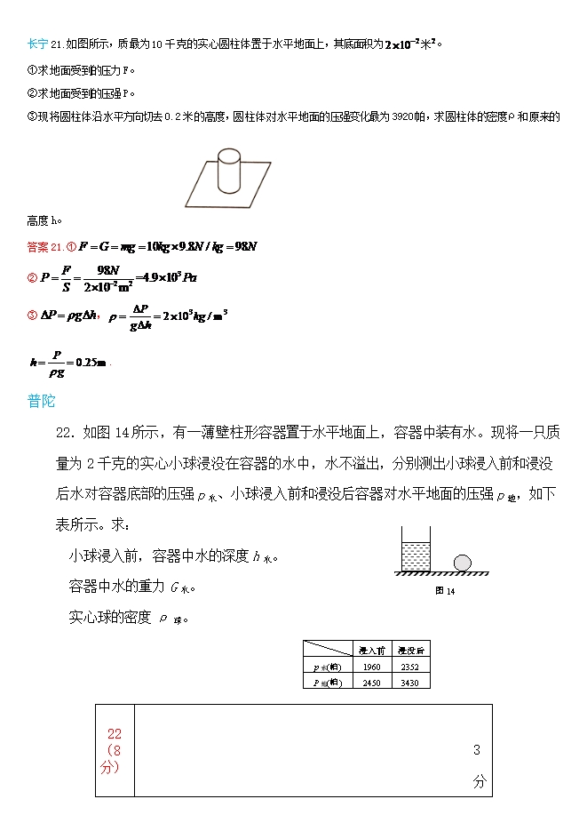 长宁21.如图所示,质最为10千克的实心圆柱体置于水平地面上,其底面积为。