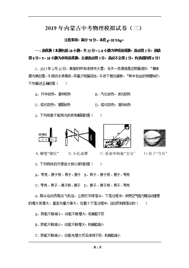 2019年内蒙古中考物理模拟试卷及答案(三)