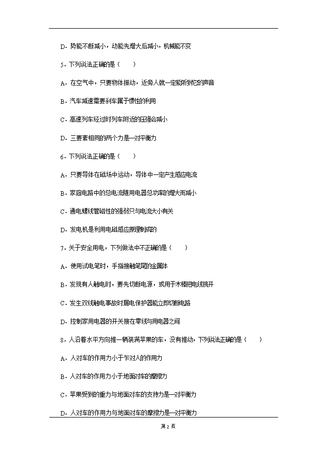 - 下一份试卷:2019年广东省初中毕业生考试物理模拟卷(五)
