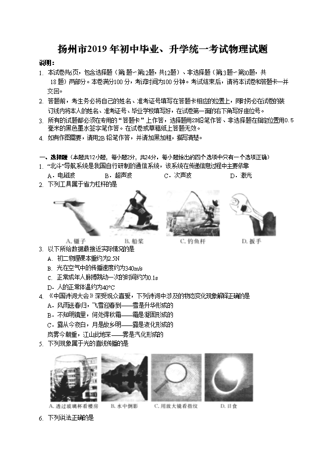2019年江苏省扬州市初中毕业、升学统一考试(中考)物理试题及答案(word版)