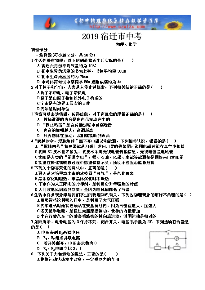 江苏省宿迁市2019年中考物理试卷及答案(word版)