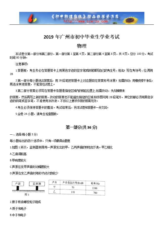 2019年广州市中考(初中毕业生学业考试)物理试卷及答案(word版)