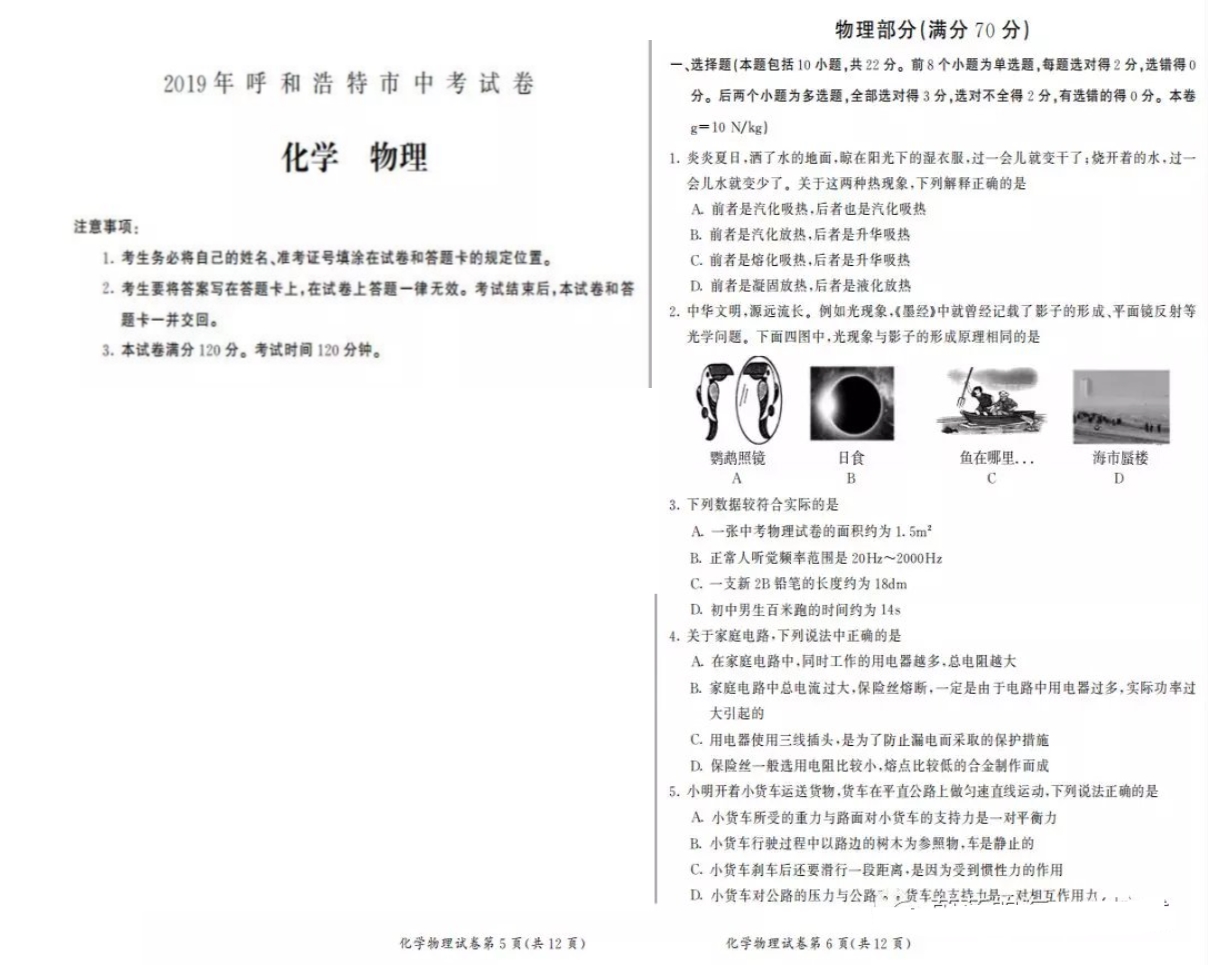 2019年内蒙古呼和浩特市初中学业毕业考试物理试卷(pdf版 有答案)