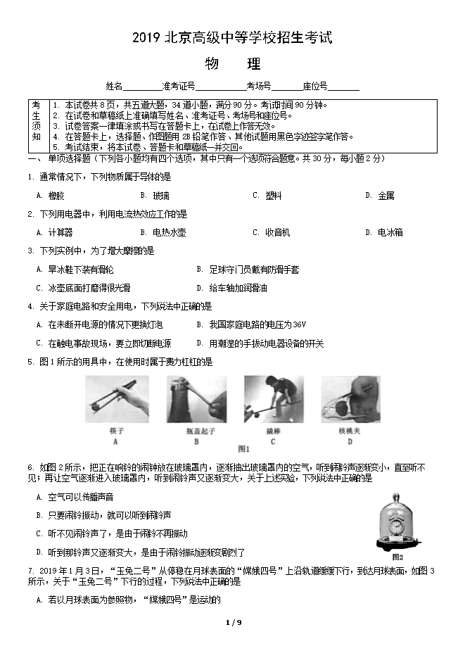 2019年北京市高级中等学校招生考试(中考)物理试题(word版,含答案)