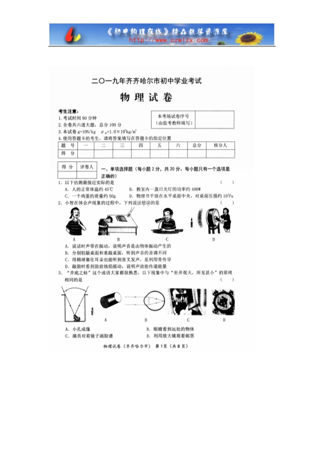 2019年黑龙江省齐齐哈尔市中考物理试题(图片版,有答案)