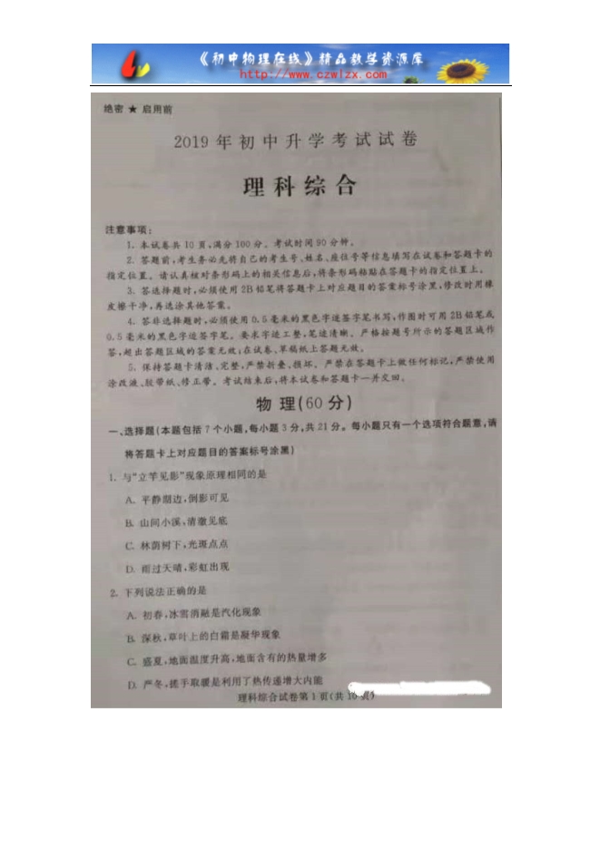 【内容简介】内蒙古包头市2019年中考理科综合物理部分真题(图片版 含答案)