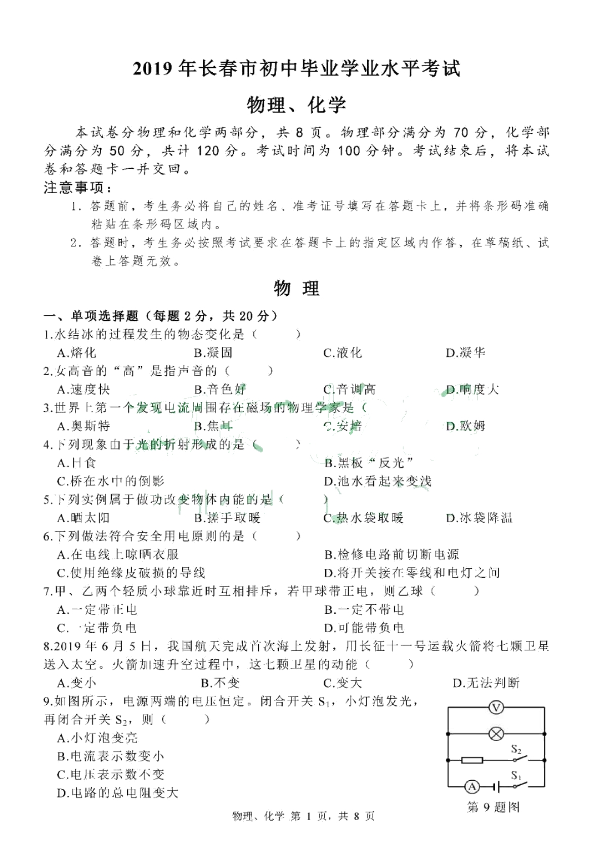 吉林省长春市2019年初中毕业生学业水平考试物理试题(pdf解析版)