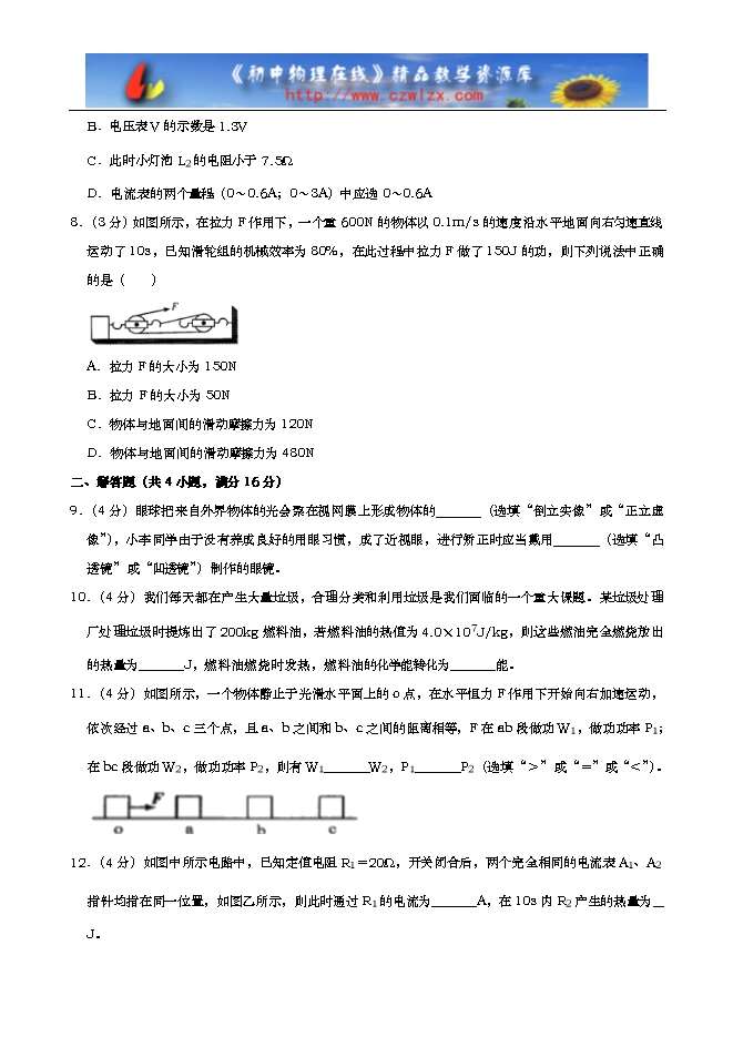 8.(3分)如图所示,在拉力F作用下,一个重600N的物体以0.1m/s的速度沿水平地面向右匀速直线运动了10s,已知滑轮组的机械效率为80%,在此过程中拉力F做了150J的功,则下列说法中正确的是( )