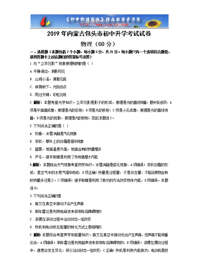 2019年内蒙古包头市中考理综物理试题(word解析版)