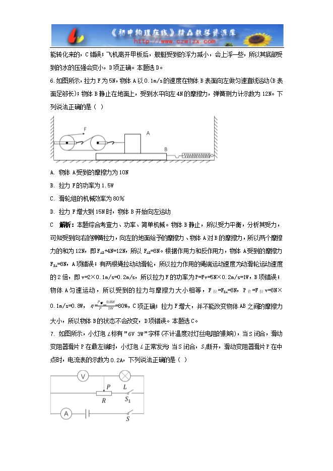 D 解析:本题综合考查运动与力、惯性知识、机械能、压强。飞机在跑道上滑行时,如果外力全部消失,根据牛顿第一定律,它会继续以原来的速度前行,不会停下来,A错误;物体的惯性由其质量决定,B项错误;飞机加速升空,速度变大,动能变大,高度上升,重力势能增大,机械能增大。但机械能的增大不是动能转化为重力势能得来,而是燃料燃烧的内能转化来的,C错误;飞机离开甲板后,舰艇受到的浮力减小,会上浮一些,所以其底部受到的水的压强会变小,D项正确。本题选D。