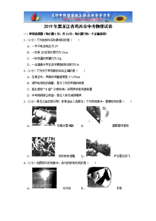 2019年黑龙江省鸡西市中考物理试卷(word版 含答案)