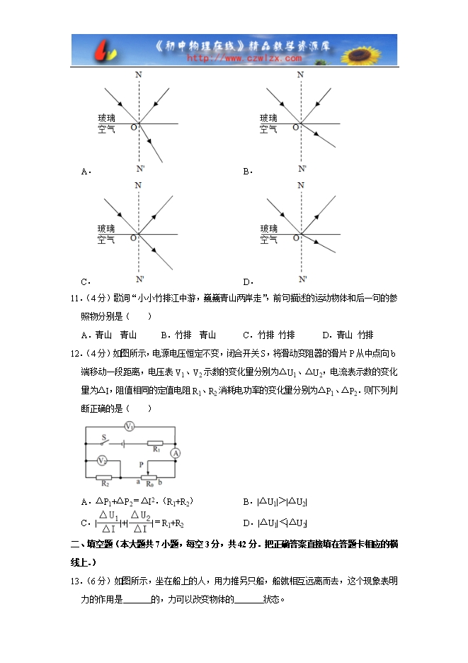 10.【解答】解:A、图中描述的是光从玻璃斜射入空气中的情境,反射光线的方向错误,不符合反射定律;折射角小于入射角,不符合折射定律,故A图不正确。