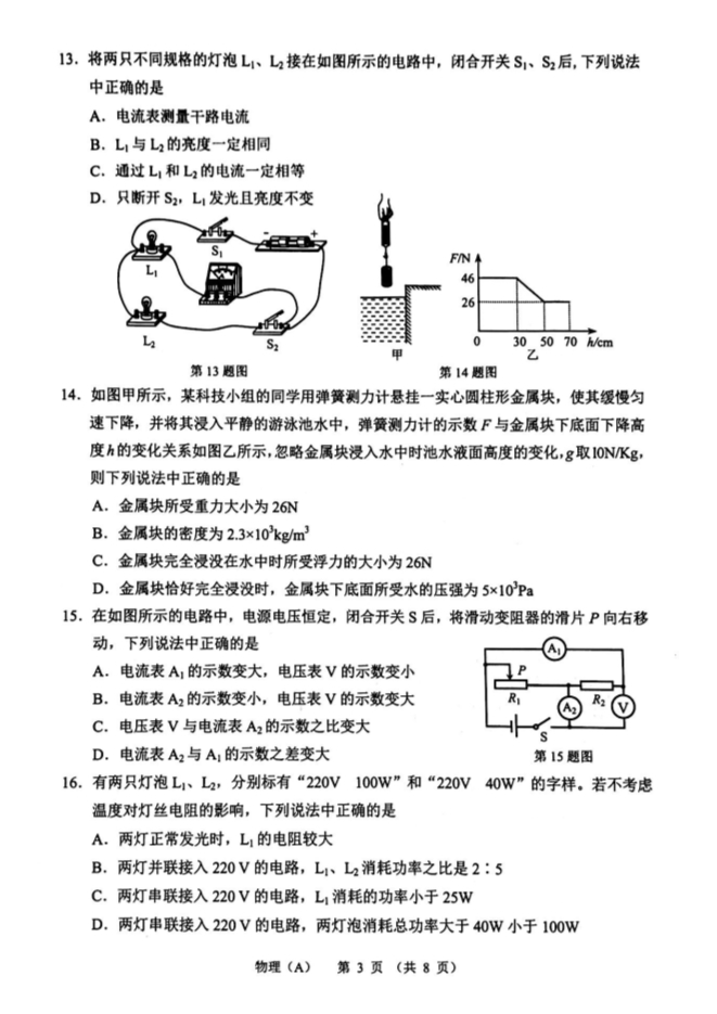 2019年甘肃省兰州市初中学业水平考试物理试卷(A卷)(pdf版)