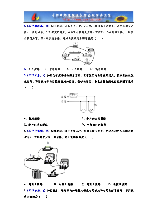 2019年中考物理试题分类汇编(第03期):电路故障专题