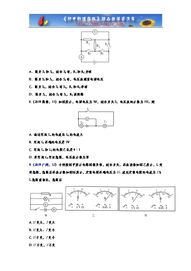 .断开S1和S3,闭合S2时,电压表测量电源电压