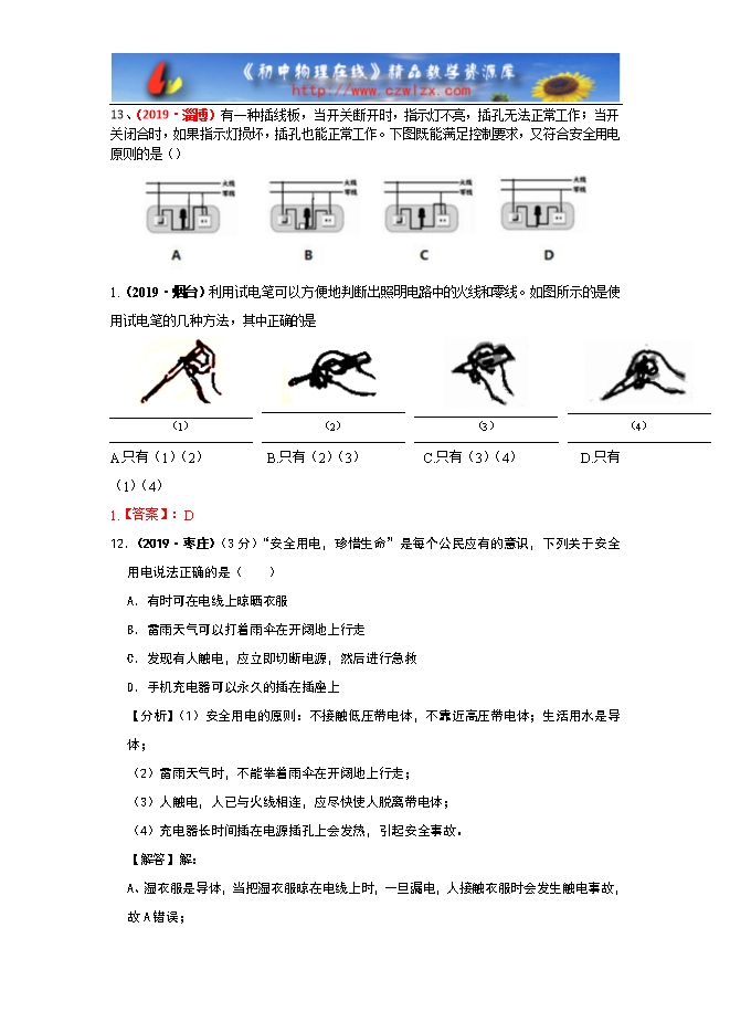 1.(2019·烟台)利用试电笔可以方便地判断出照明电路中的火线和零线。如图所示的是使用试电笔的几种方法,其中正确的是